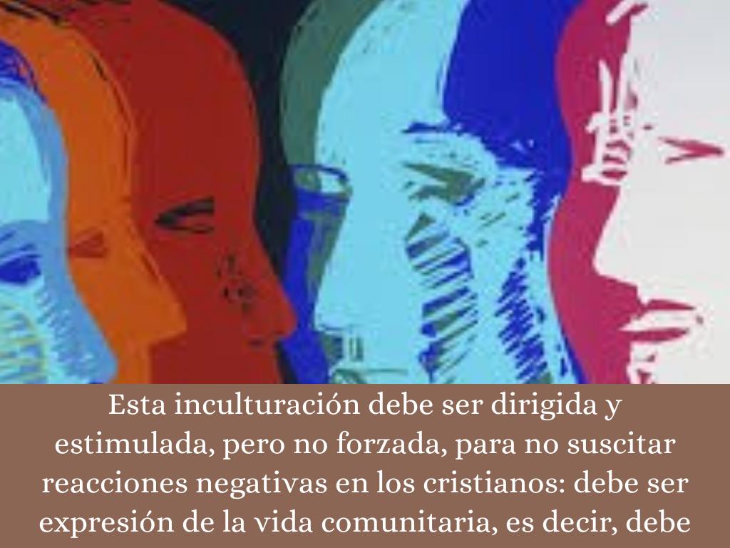 Esta inculturación debe ser dirigida y estimulada, pero no forzada, para no suscitar reacciones negativas en los cristianos: debe ser expresión de la vida comunitaria, es decir, debe madurar en el seno de la comunidad, y no ser fruto exclusivo de investigaciones eruditas