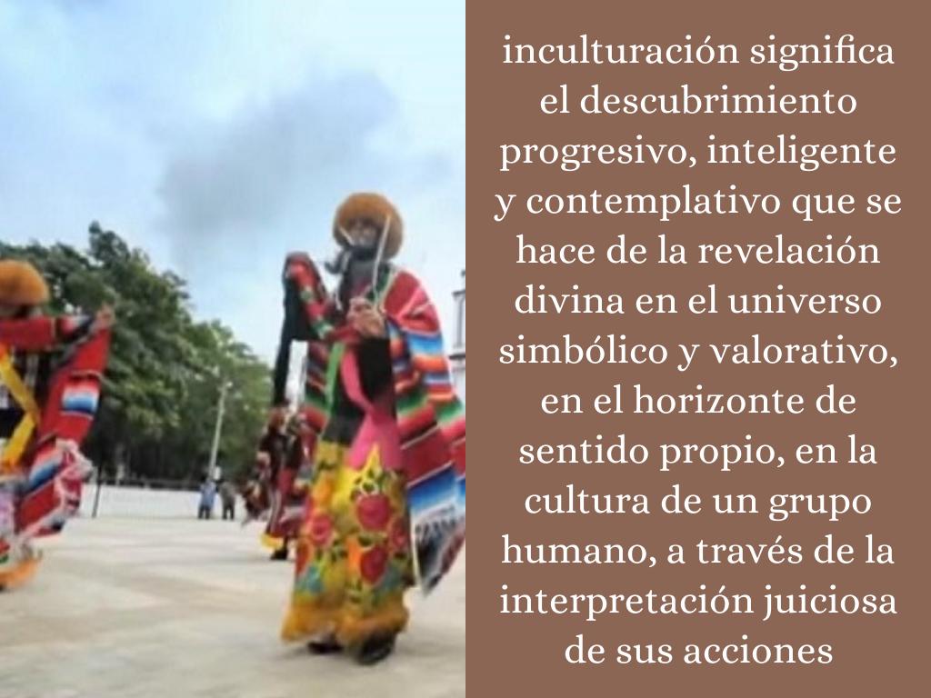 inculturación significa el descubrimiento progresivo, inteligente y contemplativo que se hace de la revelación divina en el universo simbólico y valorativo, en el horizonte de sentido propio, en la cultura de un grupo humano, a través de la interpretación juiciosa de sus acciones