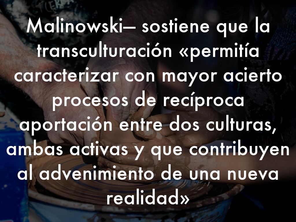 Malinowski— sostiene que la transculturación, permitía caracterizar con mayor acierto procesos de recíproca aportación entre dos culturas, ambas activas y que contribuyen al advenimiento de una nueva realidad.