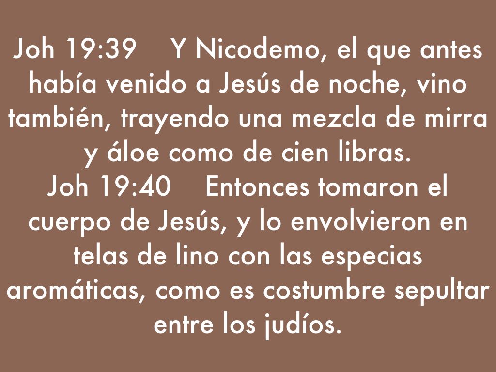 Joh 19:39 Y Nicodemo, el que antes había venido a Jesús de noche, vino también, trayendo una mezcla de mirra y áloe como de cien libras.