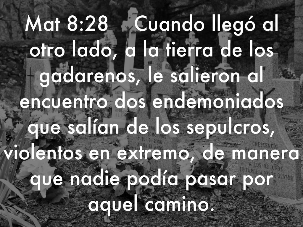 Mat 8:28 Cuando llegó al otro lado, a la tierra de los gadarenos, le salieron al encuentro dos endemoniados que salían de los sepulcros, violentos en extremo, de manera que nadie podía pasar por aquel camino.