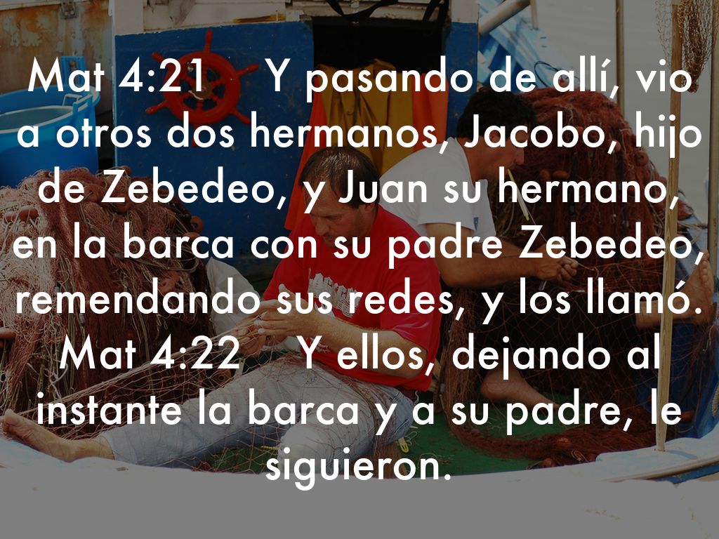 Mat 4:21 Y pasando de allí, vio a otros dos hermanos, Jacobo, hijo de Zebedeo, y Juan su hermano, en la barca con su padre Zebedeo, remendando sus redes, y los llamó.