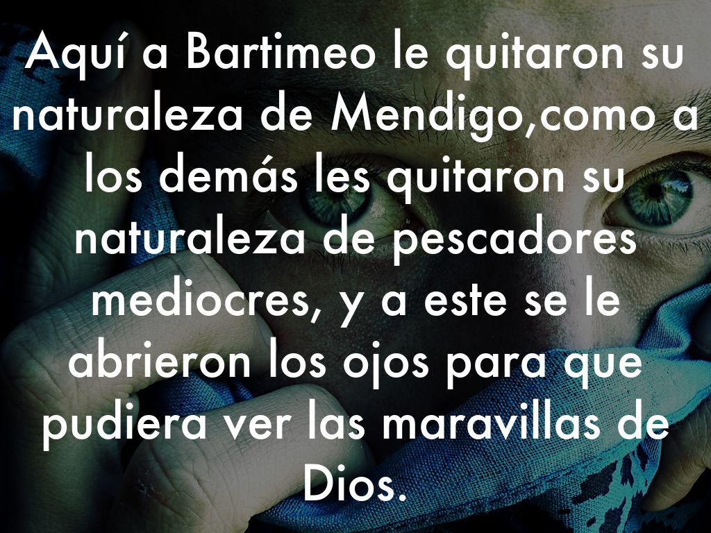 Aquí a Bartimeo le quitaron su naturaleza de Mendigo,como a los demás les quitaron su naturaleza de pescadores mediocres, y a este se le abrieron los ojos para que pudiera ver las maravillas de Dios.