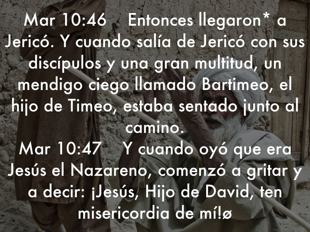 Mar 10:46 Entonces llegaron* a Jericó. Y cuando salía de Jericó con sus discípulos y una gran multitud, un mendigo ciego llamado Bartimeo, el hijo de Timeo, estaba sentado junto al camino.