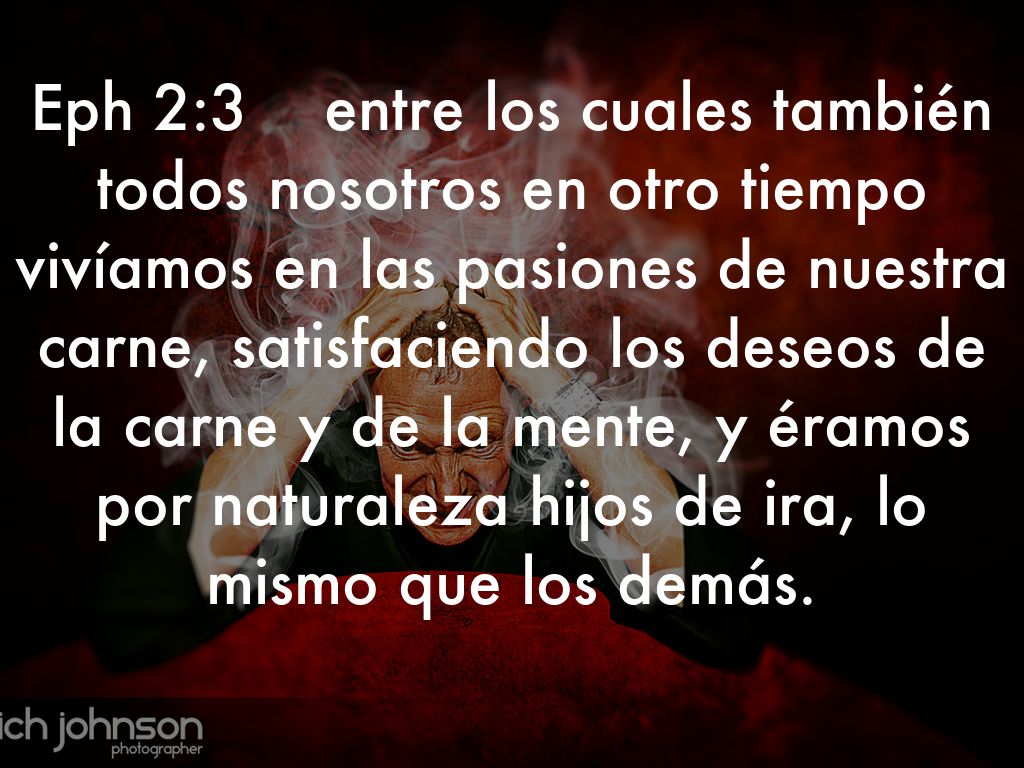 Eph 2:3 entre los cuales también todos nosotros en otro tiempo vivíamos en las pasiones de nuestra carne, satisfaciendo los deseos de la carne y de la mente, y éramos por naturaleza hijos de ira, lo mismo que los demás.