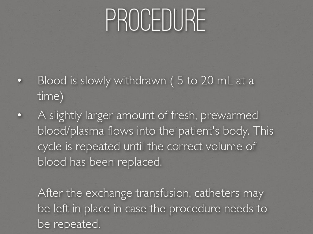 After the exchange transfusion, catheters may be left in place in case the procedure needs to be repeated.