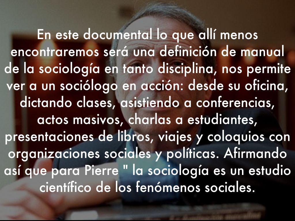 En este documental lo que allí menos encontraremos será una definición de manual de la sociología en tanto disciplina, nos permite ver a un sociólogo en acción: desde su oficina, dictando clases, asistiendo a conferencias, actos masivos, charlas a estudiantes, presentaciones de libros, viajes y coloquios con organizaciones sociales y políticas. Afirmando así que para Pierre " la sociología es un estudio científico de los fenómenos sociales.