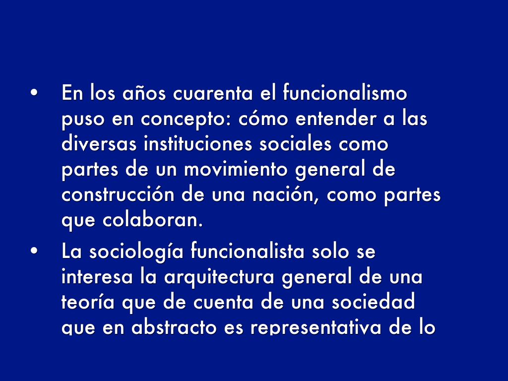 - En los años cuarenta el funcionalismo puso en concepto: cómo entender a las diversas instituciones sociales como partes de un movimiento general de construcción de una nación, como partes que colaboran.