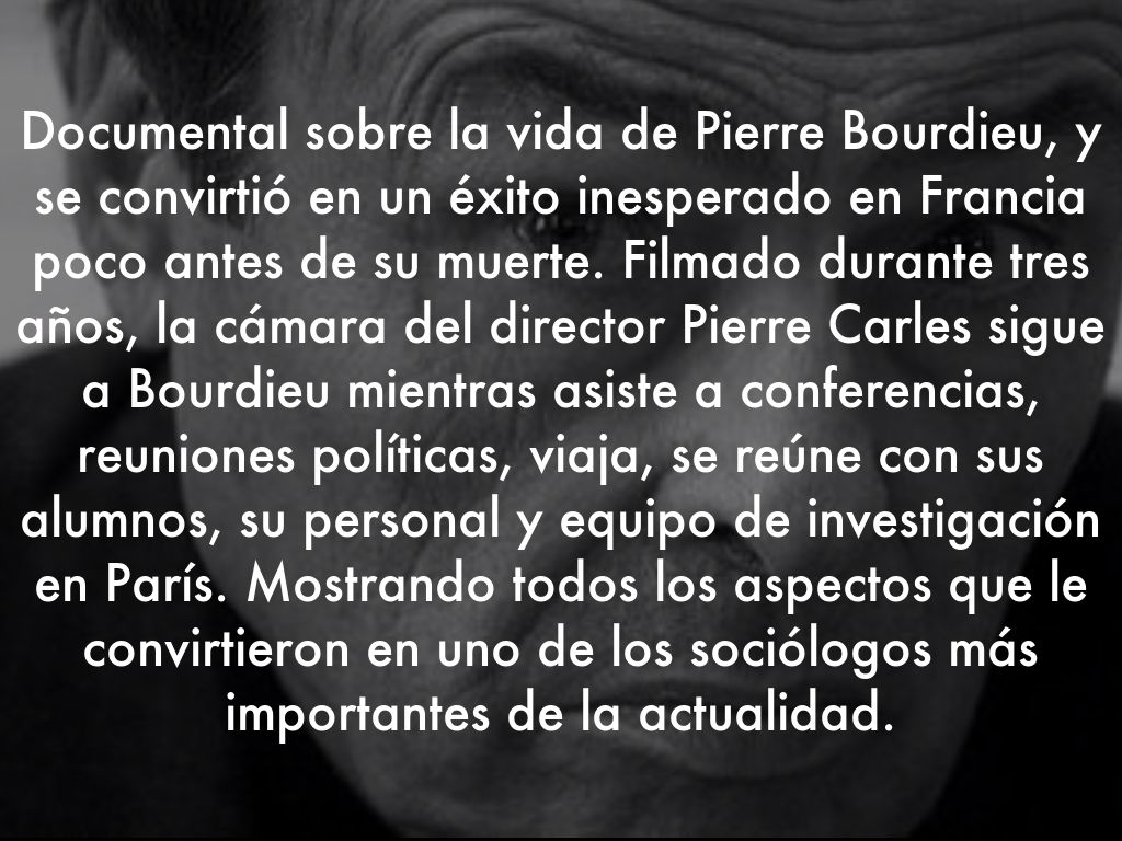 Documental sobre la vida de Pierre Bourdieu, y se convirtió en un éxito inesperado en Francia poco antes de su muerte. Filmado durante tres años, la cámara del director Pierre Carles sigue a Bourdieu mientras asiste a conferencias, reuniones políticas, viaja, se reúne con sus alumnos, su personal y equipo de investigación en París. Mostrando todos los aspectos que le convirtieron en uno de los sociólogos más importantes de la actualidad.