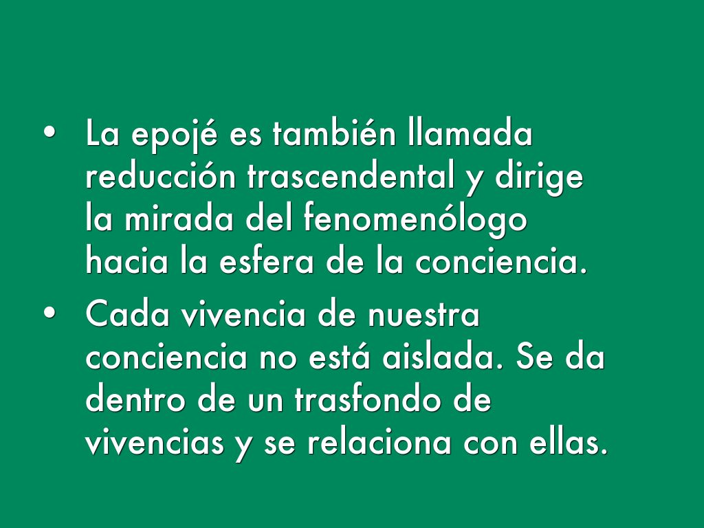 - La epojé es también llamada reducción trascendental y dirige la mirada del fenomenólogo hacia la esfera de la conciencia.