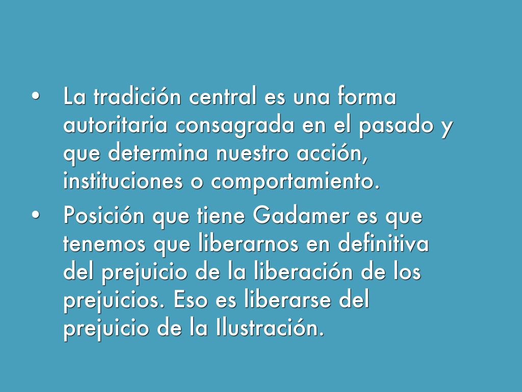 - Posición que tiene Gadamer es que tenemos que liberarnos en definitiva del prejuicio de la liberación de los prejuicios. Eso es liberarse del prejuicio de la Ilustración.
