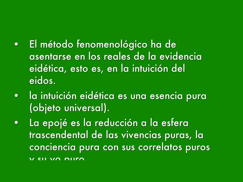 - El método fenomenológico ha de asentarse en los reales de la evidencia eidética, esto es, en la intuición del eidos.