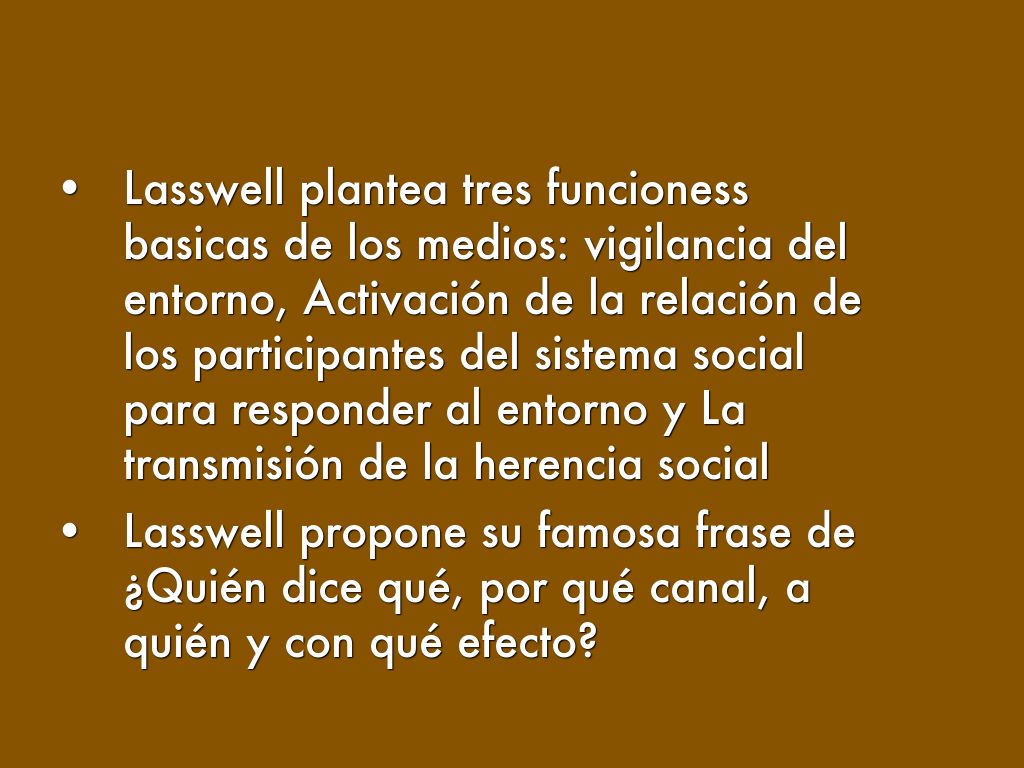 - Lasswell plantea tres funcioness basicas de los medios: vigilancia del entorno, Activación de la relación de los participantes del sistema social para responder al entorno y La transmisión de la herencia social