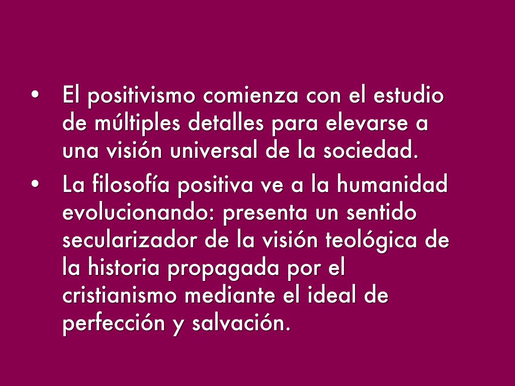 - El positivismo tiene un carácter altamente optimista: cree en el progreso continuo de la sociedad.