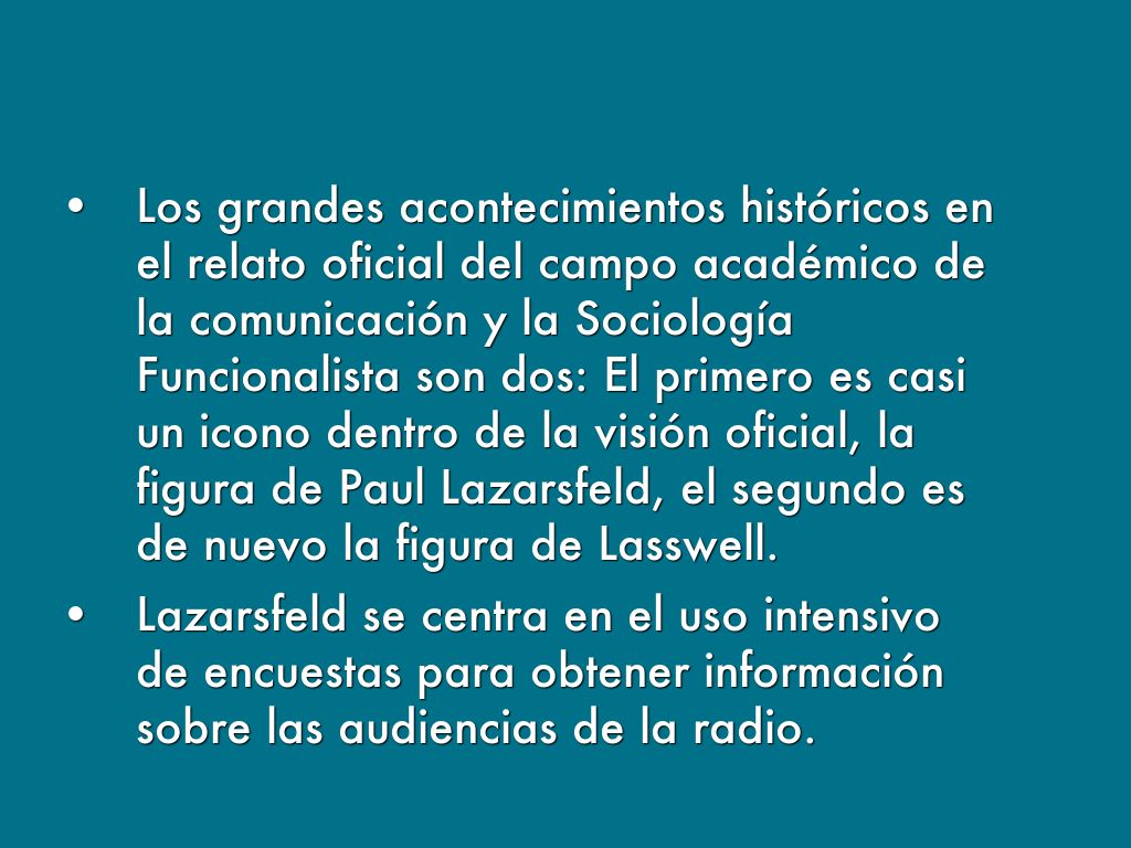 - Los grandes acontecimientos históricos en el relato oficial del campo académico de la comunicación y la Sociología Funcionalista son dos: El primero es casi un icono dentro de la visión oficial, la figura de Paul Lazarsfeld, el segundo es de nuevo la figura de Lasswell.