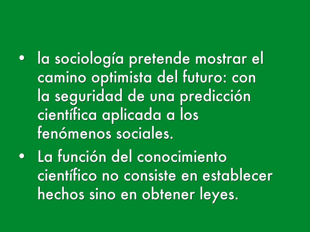 - la sociología pretende mostrar el camino optimista del futuro: con la seguridad de una predicción científica aplicada a los fenómenos sociales.