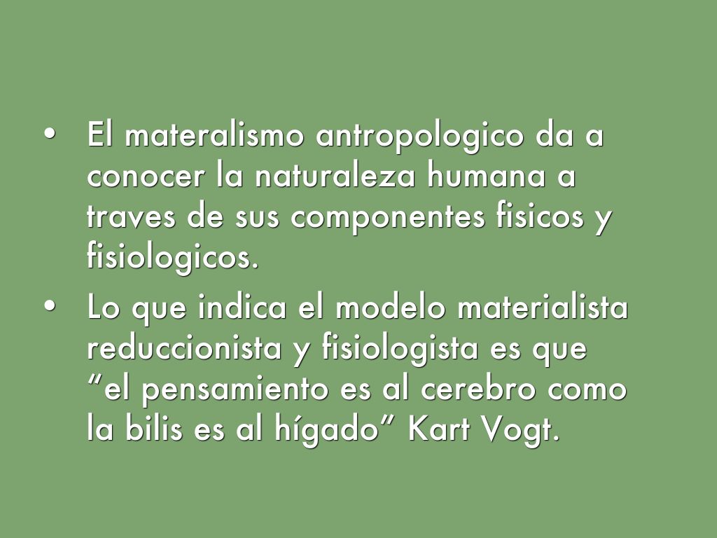 - El materalismo antropologico da a conocer la naturaleza humana a traves de sus componentes fisicos y fisiologicos.