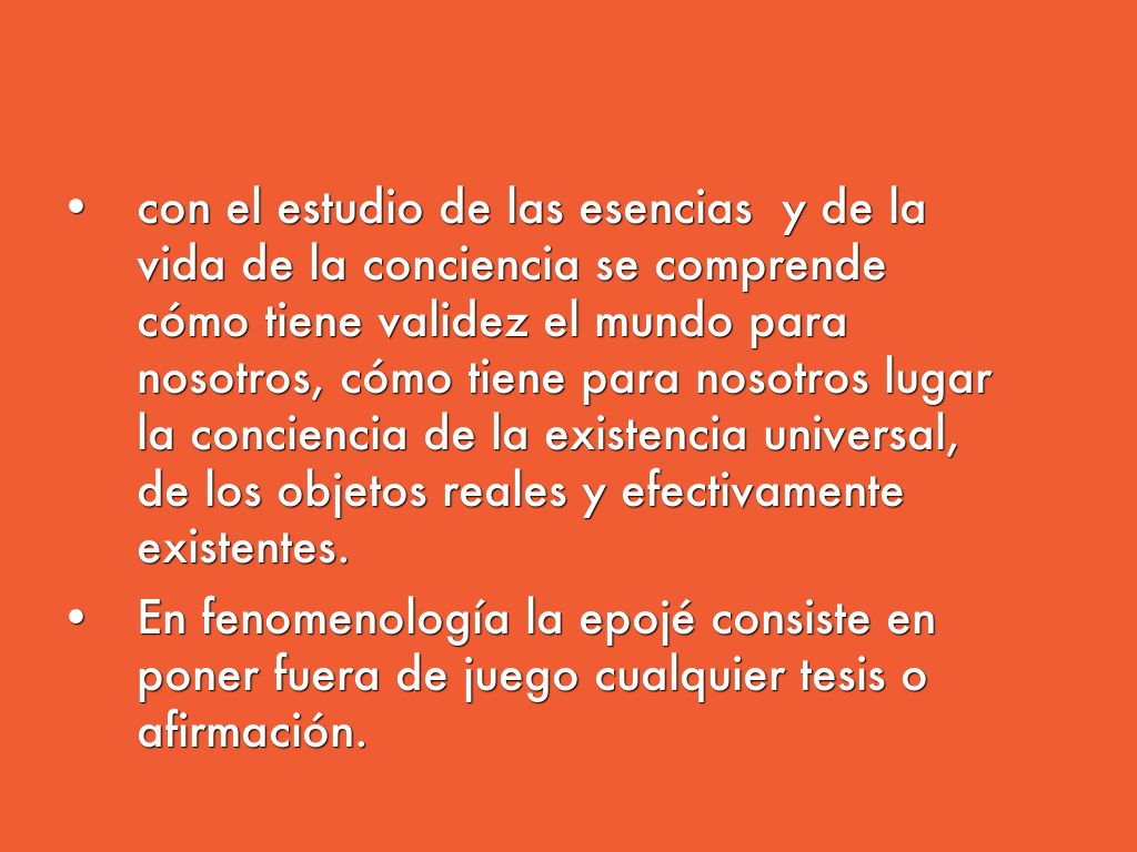 - con el estudio de las esencias y de la vida de la conciencia se comprende cómo tiene validez el mundo para nosotros, cómo tiene para nosotros lugar la conciencia de la existencia universal, de los objetos reales y efectivamente existentes.