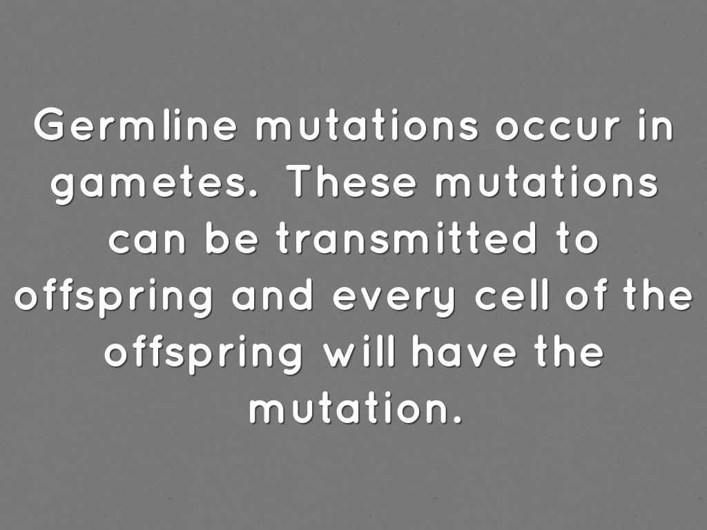 Germline mutations occur in gametes. These mutations can be transmitted to offspring and every cell of the offspring will have the mutation.