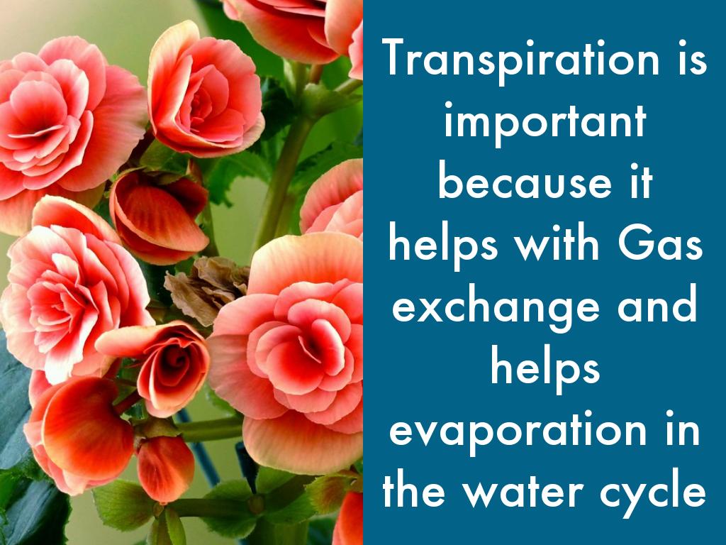 Transpiration is important because it helps with Gas exchange and helps evaporation in the water cycle