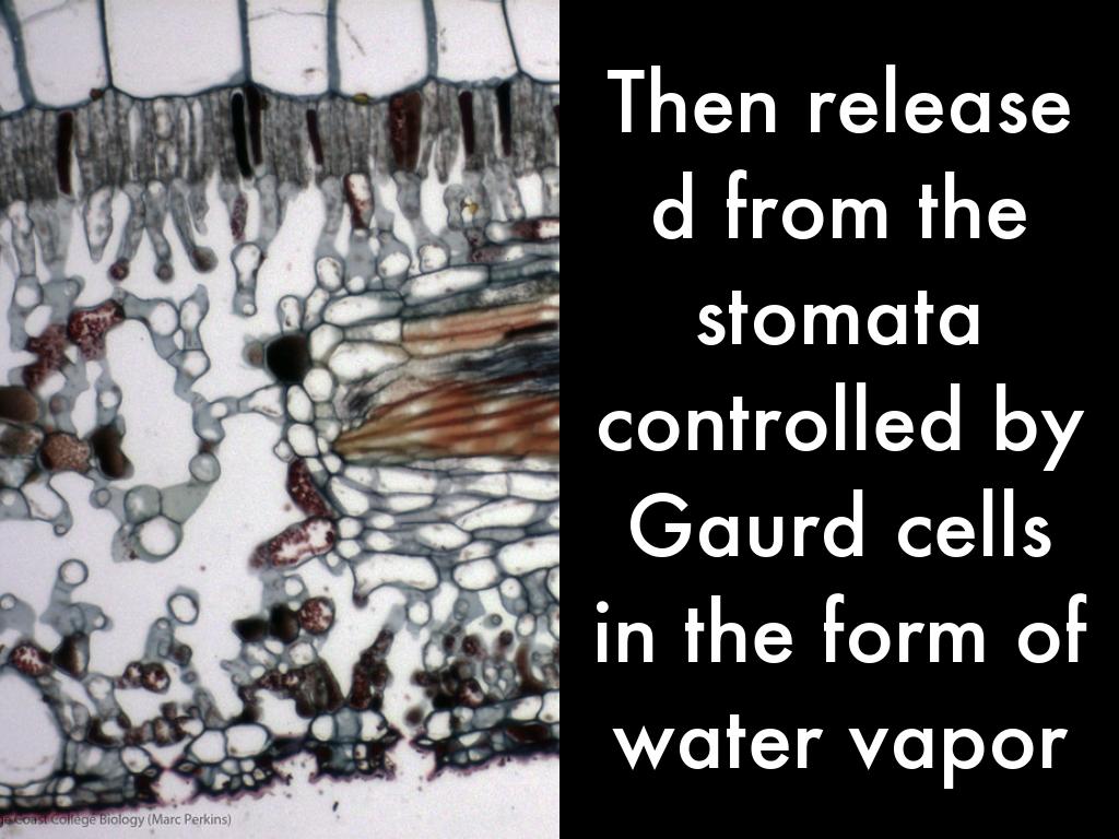 Then release d from the stomata controlled by Gaurd cells in the form of water vapor