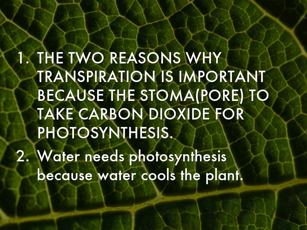 • THE TWO REASONS WHY TRANSPIRATION IS IMPORTANT BECAUSE THE STOMA(PORE) TO TAKE CARBON DIOXIDE FOR PHOTOSYNTHESIS.
