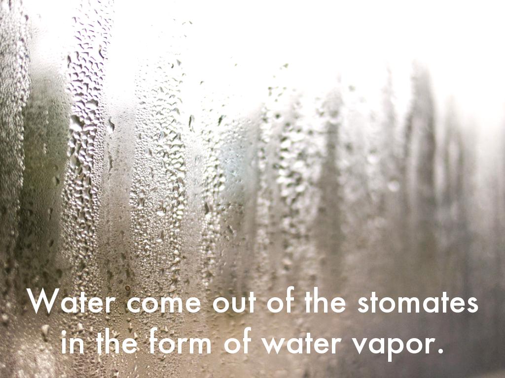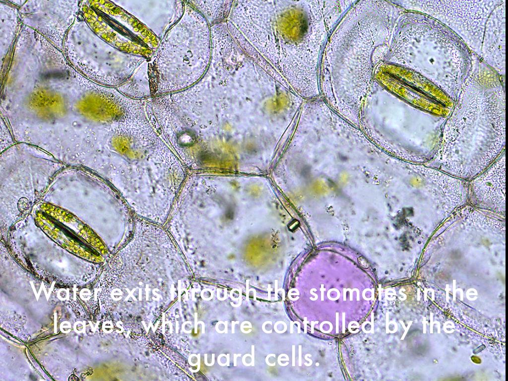 Water exits through the stomates in the leaves, which are controlled by the guard cells.