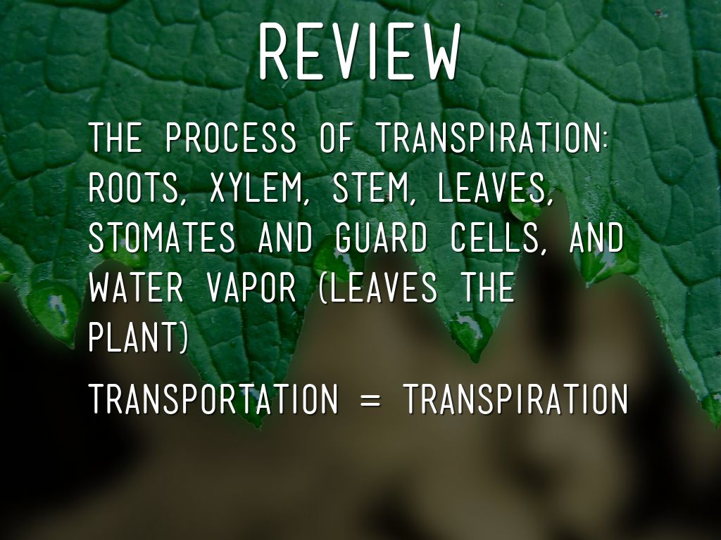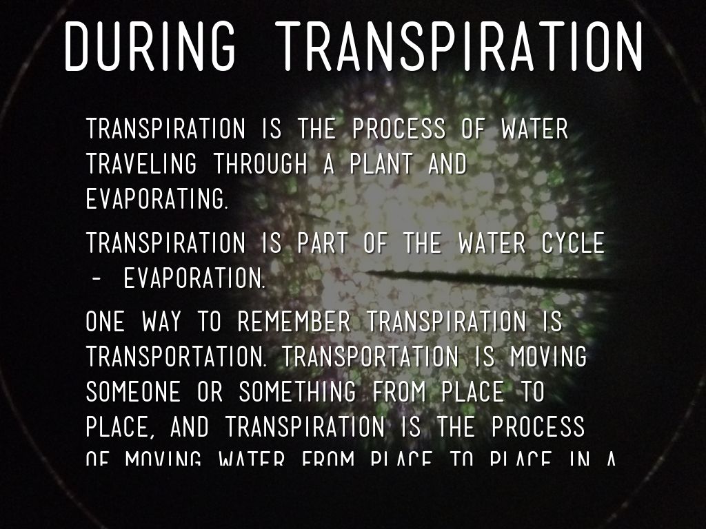 One way to remember transpiration is transportation. Transportation is moving someone or something from place to place, and transpiration is the process of moving water from place to place in a plant.