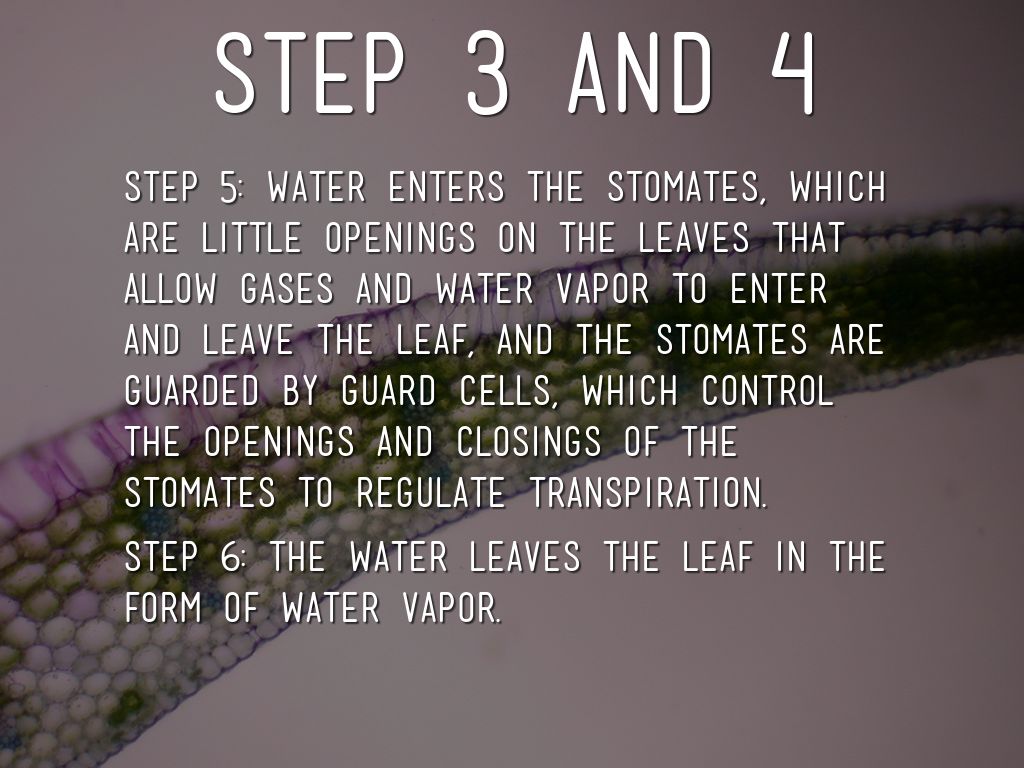 Step 5: Water enters the stomates, which are little openings on the leaves that allow gases and water vapor to enter and leave the leaf, and the stomates are guarded by guard cells, which control the openings and closings of the stomates to regulate transpiration.
