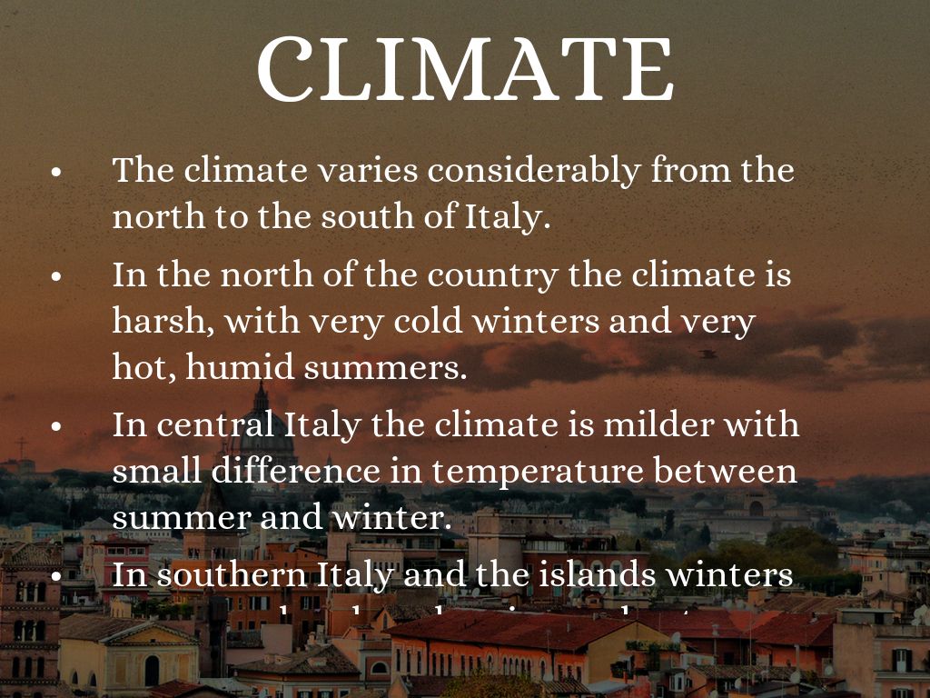 In southern Italy and the islands winters are never harsh and spring and autumn temperatures are similar to those reached in the summer in other areas of Italy.