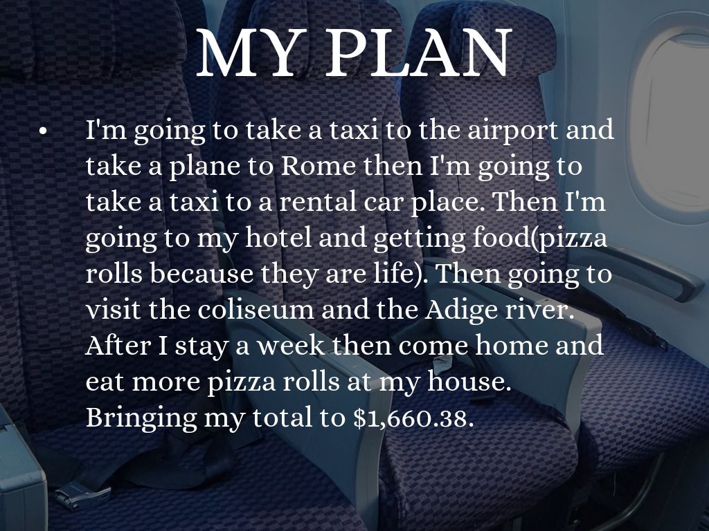 I'm going to take a taxi to the airport and take a plane to Rome then I'm going to take a taxi to a rental car place. Then I'm going to my hotel and getting food(pizza rolls because they are life). Then going to visit the coliseum and the Adige river. After I stay a week then come home and eat more pizza rolls at my house. Bringing my total to $1,660.38.