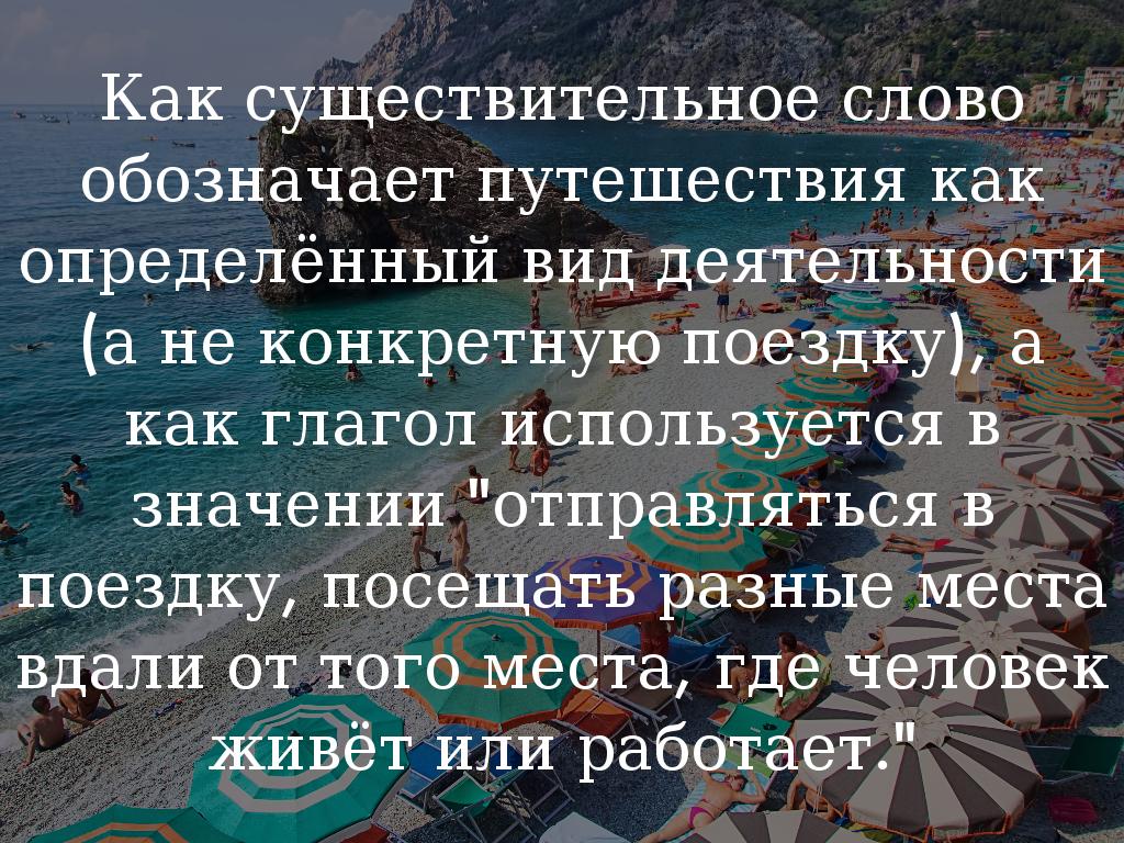 Как существительное слово обозначает путешествия как определённый вид деятельности (а не конкретную поездку), а как глагол используется в значении "отправляться в поездку, посещать разные места вдали от того места, где человек живёт или работает."