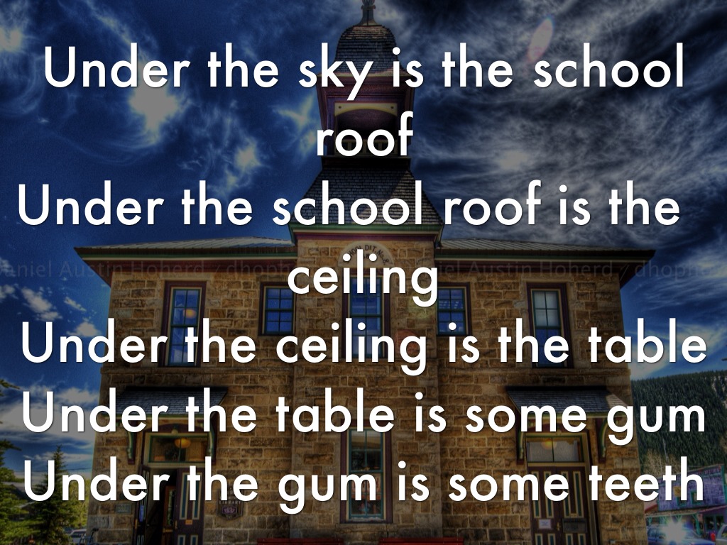 Under the sky is the school roof Under the school roof is the ceiling Under the ceiling is the table Under the table is some gum Under the gum is some teeth