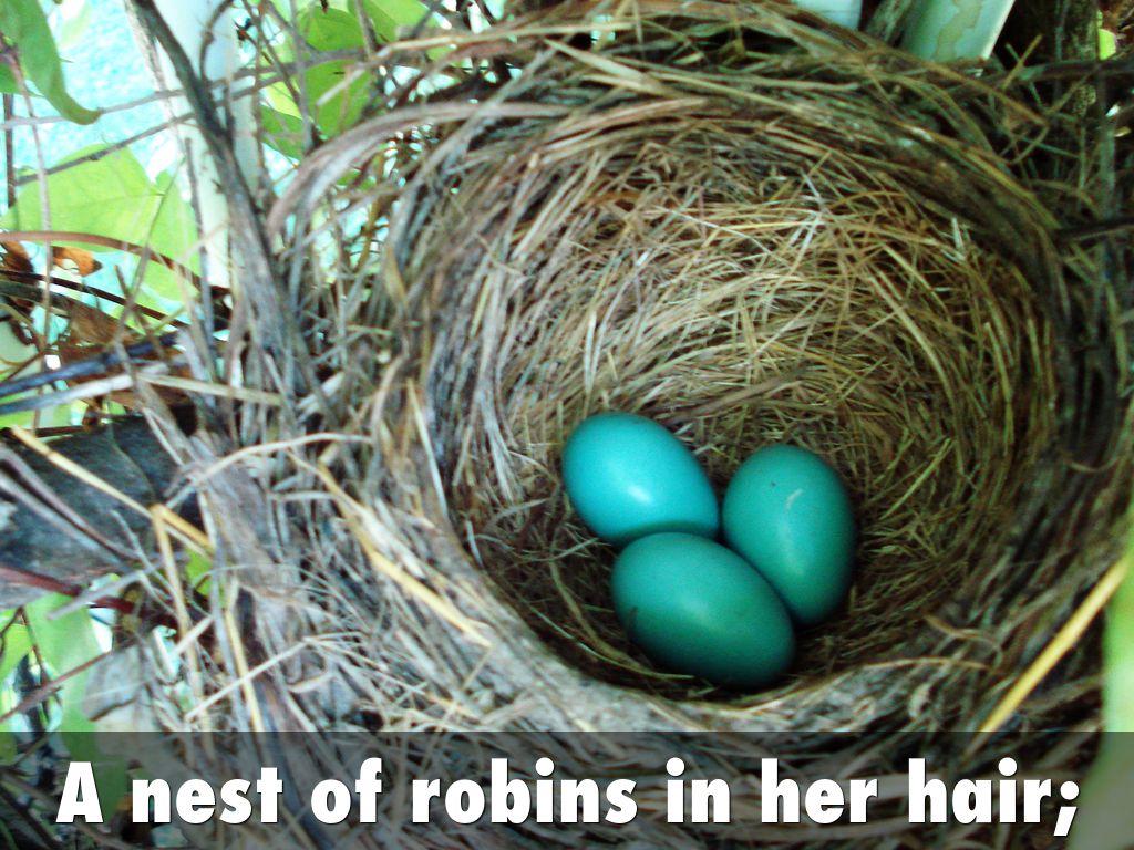 A nest of robins in her hair;
