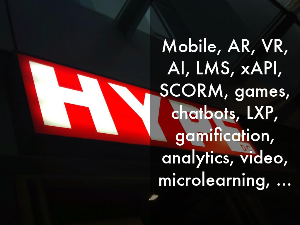 Mobile, AR, VR, AI, LMS, xAPI, SCORM, games, chatbots, LXP, gamification, analytics, video, microlearning, ...