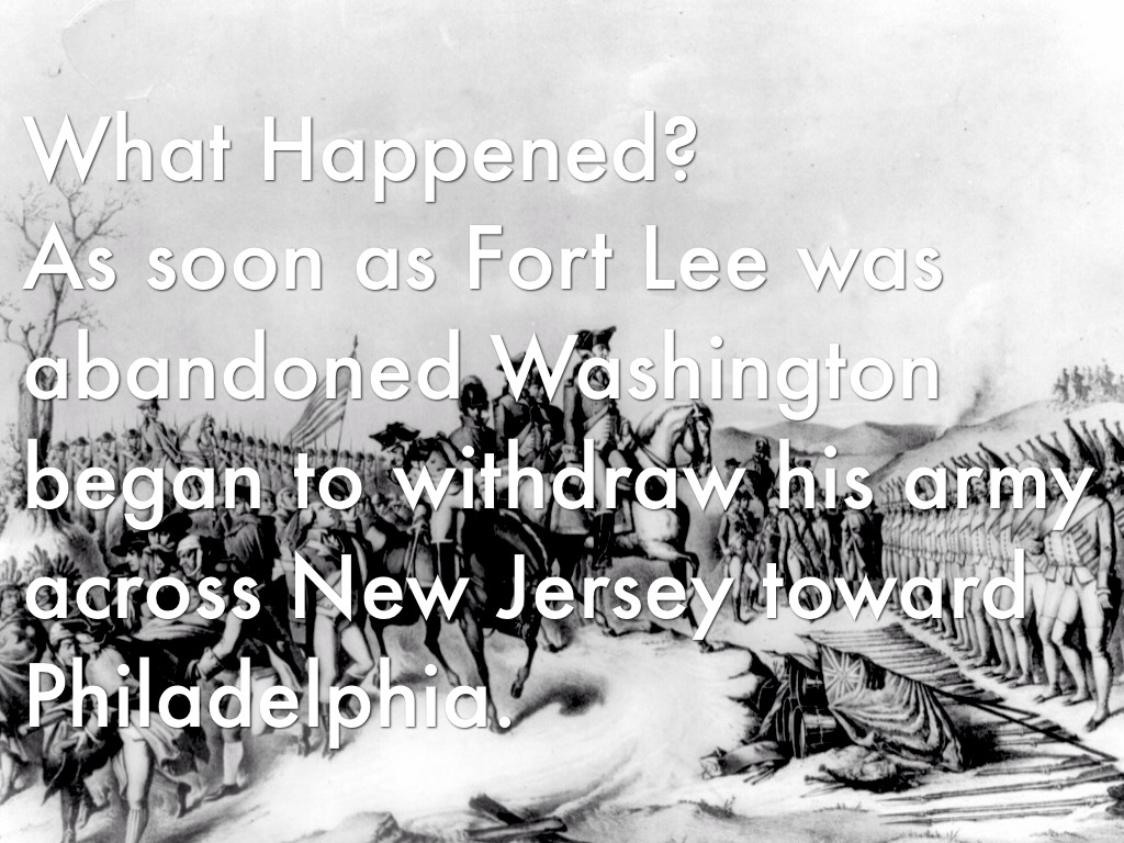 As soon as Fort Lee was abandoned Washington began to withdraw his army across New Jersey toward Philadelphia.