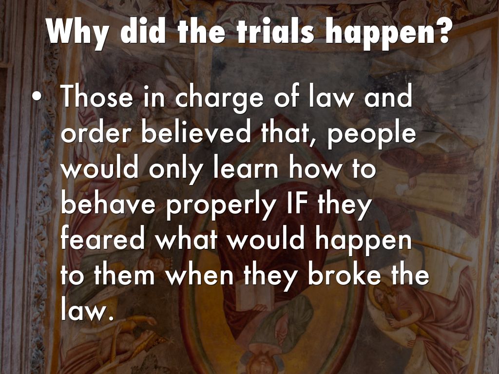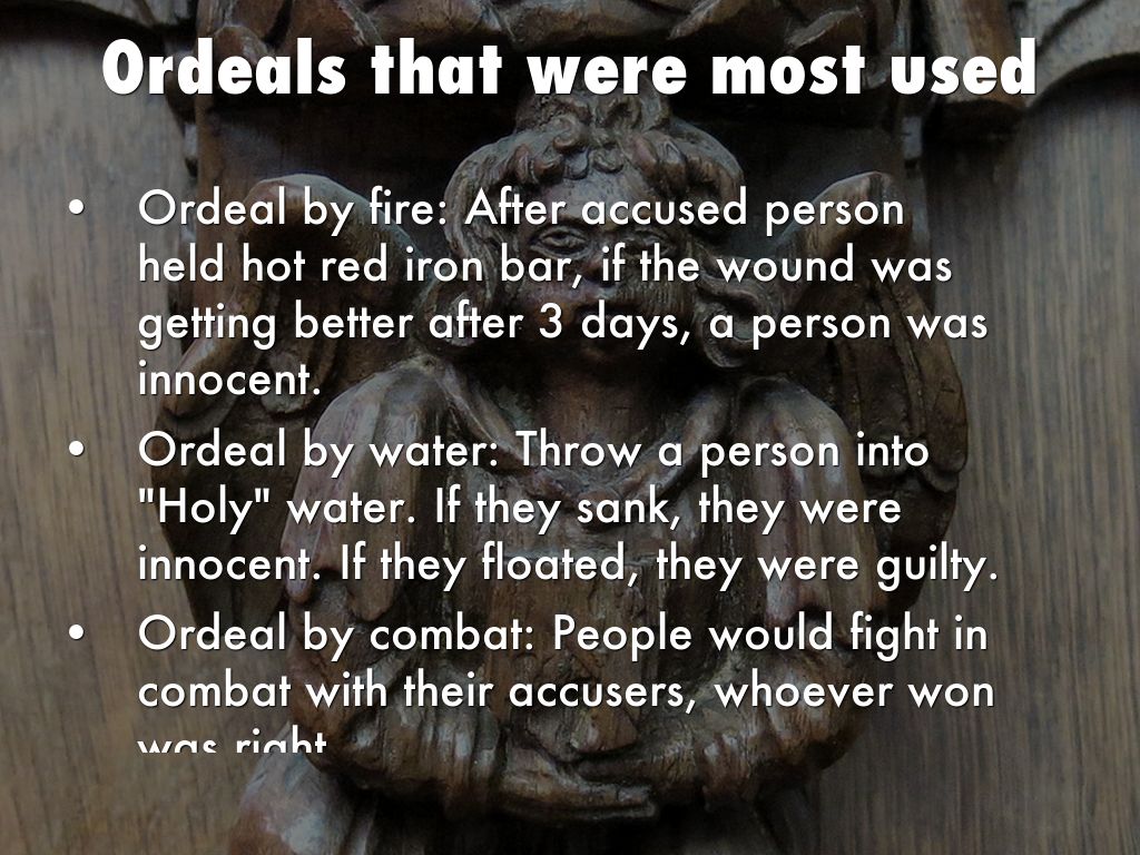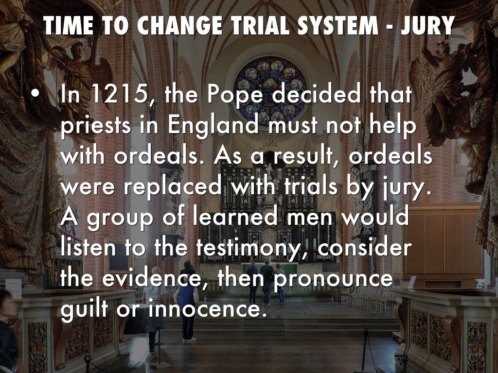 In 1215, the Pope decided that priests in England must not help with ordeals. As a result, ordeals were replaced with trials by jury. A group of learned men would listen to the testimony, consider the evidence, then pronounce guilt or innocence.