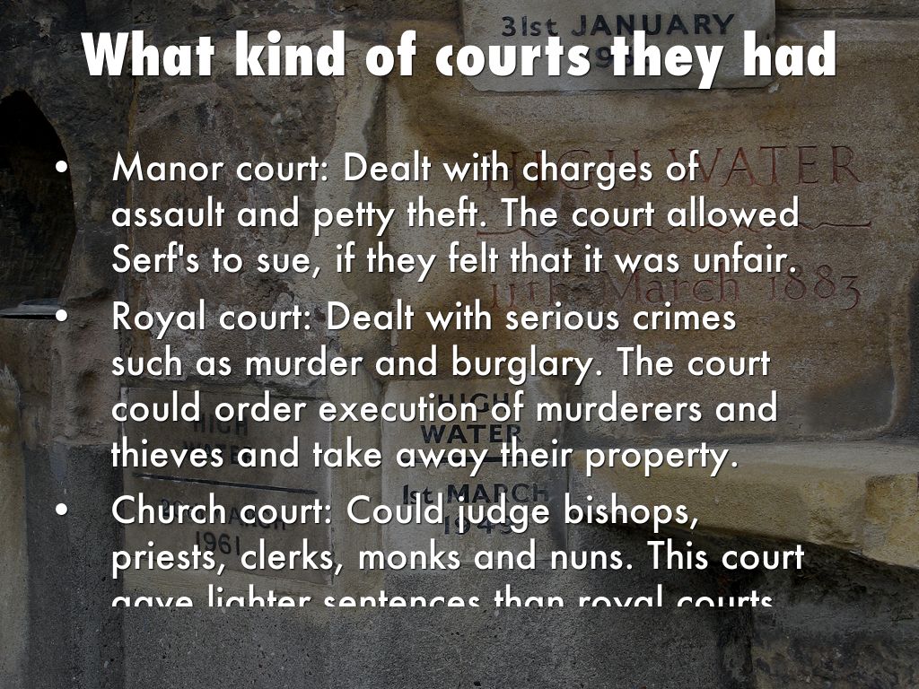 Manor court: Dealt with charges of assault and petty theft. The court allowed Serf's to sue, if they felt that it was unfair.