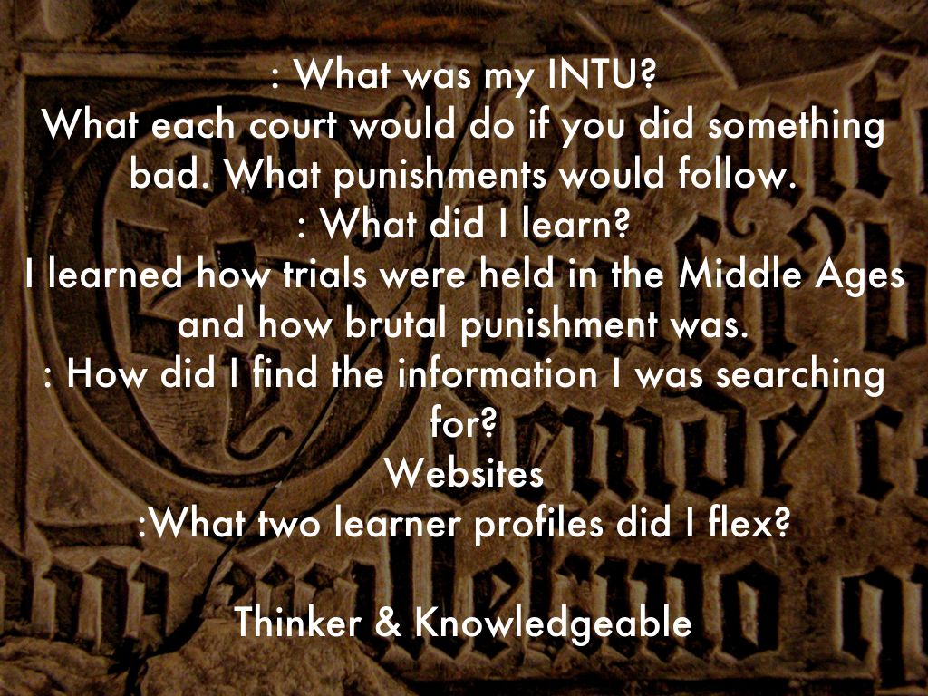: What was my INTU? What each court would do if you did something bad. What punishments would follow. : What did I learn? I learned how trials were held in the Middle Ages and how brutal punishment was. : How did I find the information I was searching for? Websites :What two learner profiles did I flex?