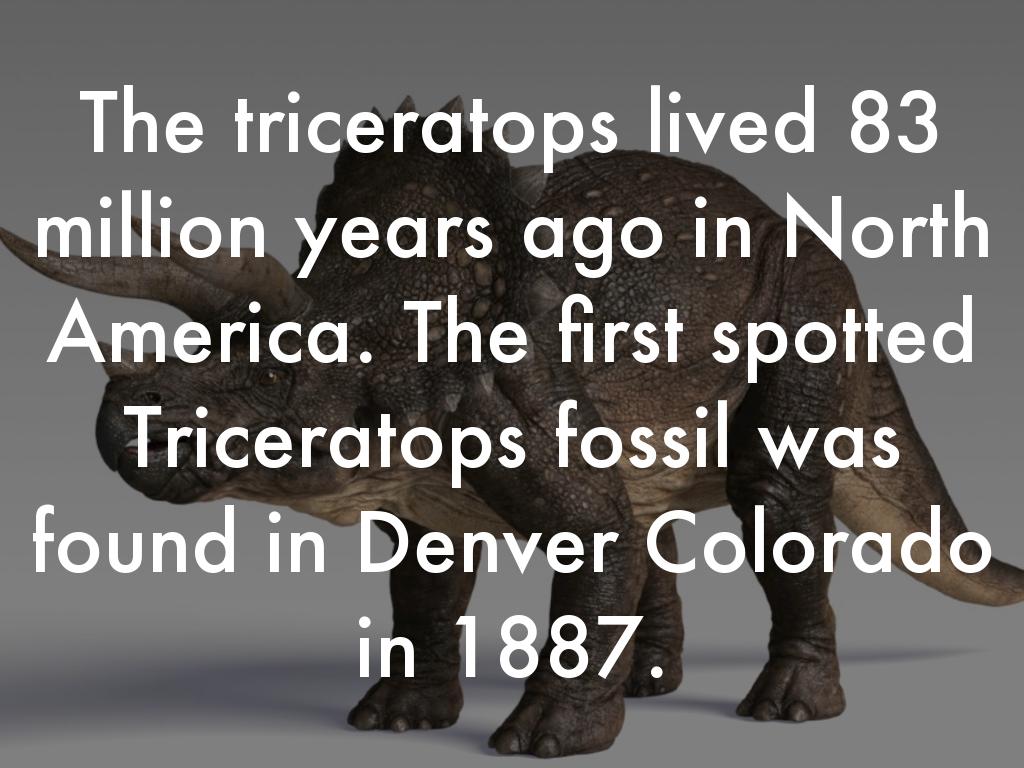 The triceratops lived 83 million years ago in North America. The first spotted Triceratops fossil was found in Denver Colorado in 1887.