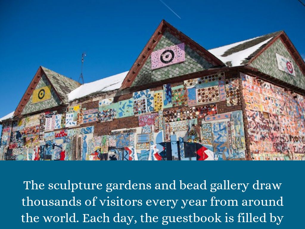 The sculpture gardens and bead gallery draw thousands of visitors every year from around the world. Each day, the guestbook is filled by artists, writers, musicians, mothers and fathers. From people in the neighborhood to internationally renowned artists and Hollywood icons including Wesley Snipes and Quentin Tarantino, MBAD African Bead Museum has become a home and an inspiration to many.