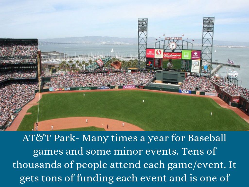 AT&T Park- Many times a year for Baseball games and some minor events. Tens of thousands of people attend each game/event. It gets tons of funding each event and is one of the most popular places in America.