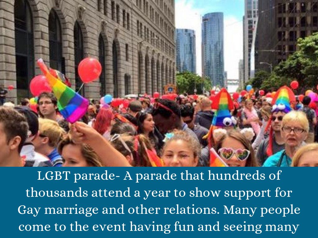 LGBT parade- A parade that hundreds of thousands attend a year to show support for Gay marriage and other relations. Many people come to the event having fun and seeing many different symbols of the occasion such as rainbow colors and more. The parade has been a thing for YEARS.