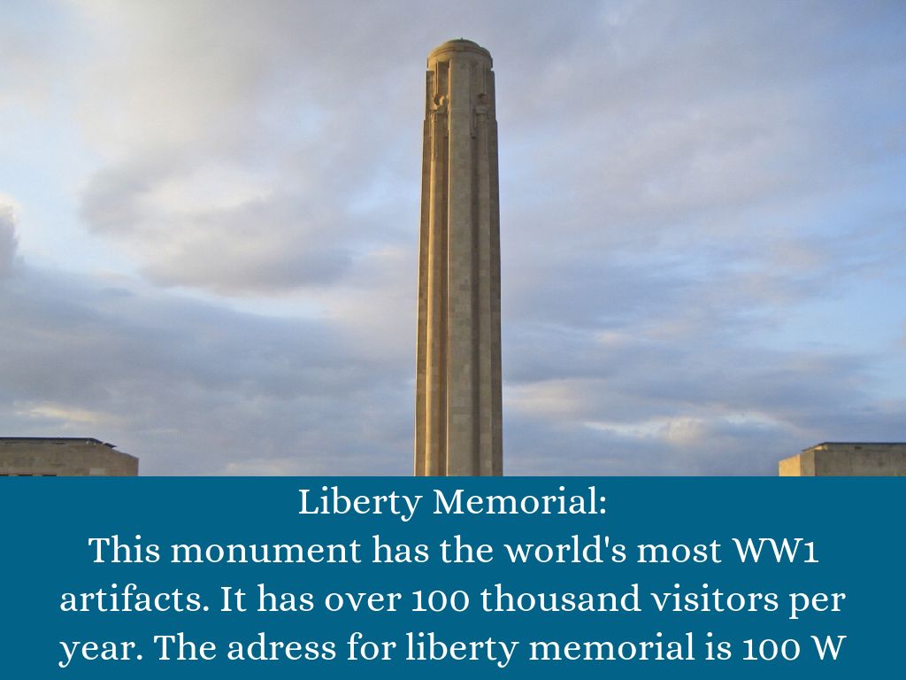 This monument has the world's most WW1 artifacts. It has over 100 thousand visitors per year. The adress for liberty memorial is 100 W 26th St, Kansas City, MO 64108.