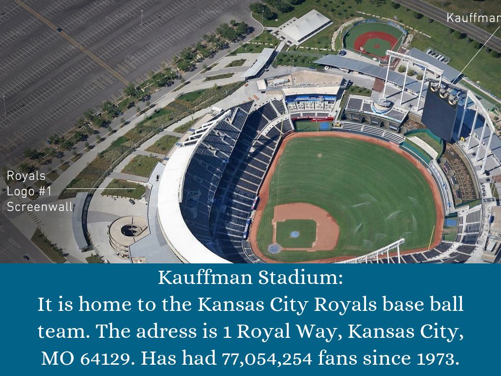 It is home to the Kansas City Royals base ball team. The adress is 1 Royal Way, Kansas City, MO 64129. Has had 77,054,254 fans since 1973. Brings millions of fans each year