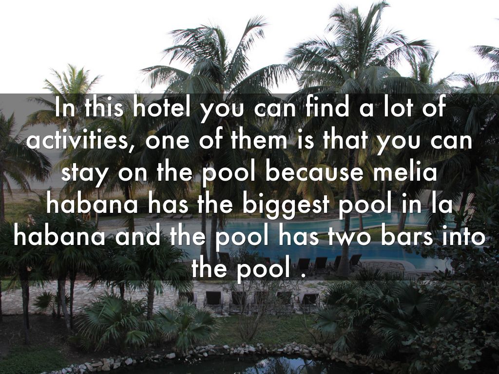 In this hotel you can find a lot of activities, one of them is that you can stay on the pool because melia habana has the biggest pool in la habana and the pool has two bars into the pool .