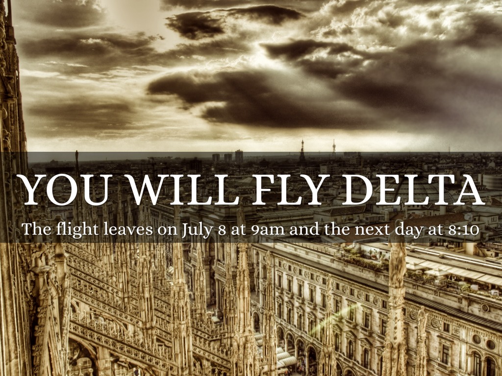 The flight leaves on July 8 at 9am and arrives the next day in Italy at 8:10
