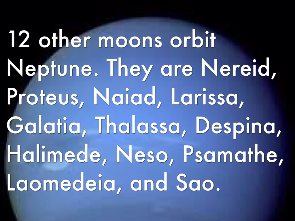 12 other moons orbit Neptune. They are Nereid, Proteus, Naiad, Larissa, Galatia, Thalassa, Despina, Halimede, Neso, Psamathe, Laomedeia, and Sao.