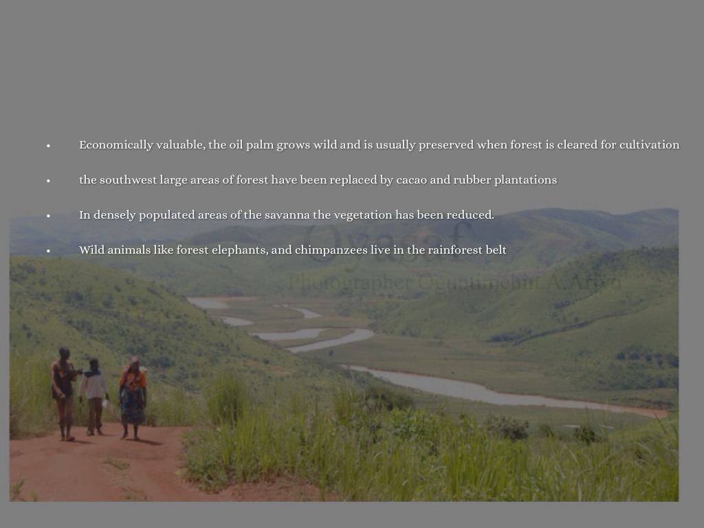 • Wild animals like forest elephants, and chimpanzees live in the rainforest belt