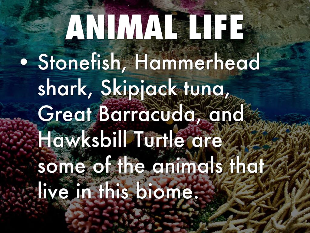 Stonefish, Hammerhead shark, Skipjack tuna, Great Barracuda, and Hawksbill Turtle are some of the animals that live in this biome.